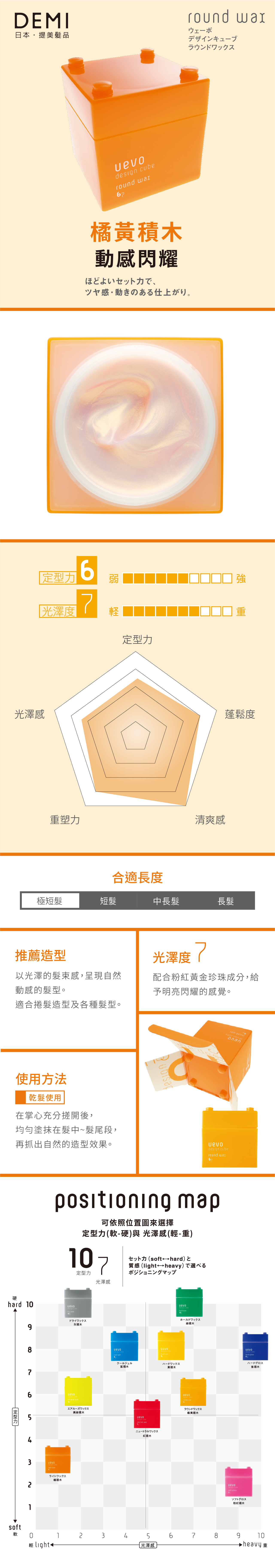 乾髮|取適量橘黃積木於手心搓開,均勻塗抹在髮中到髮尾,抓出自然造型效果