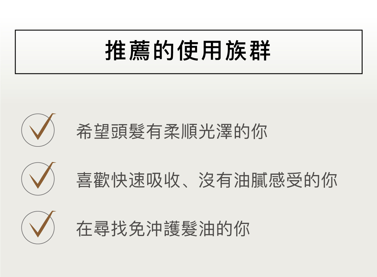 按壓2-3滴於雙手掌心,雙手塗抹開來後,再均勻塗抹於微濕的髮上,無須沖洗,直接進行吹風梳理