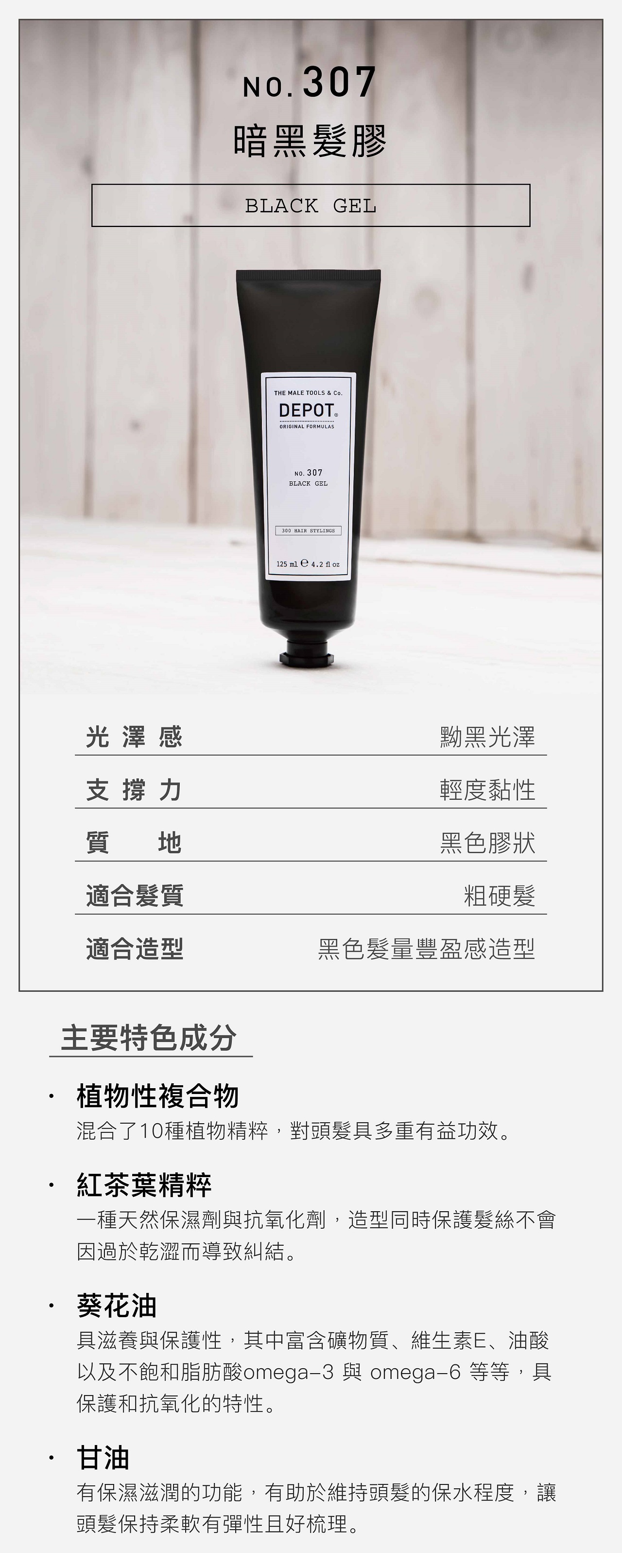 取適量髮膠塗抹在雙手上,均勻塗抹於微濕髮或乾髮上,再取適量的造型品,依照需求開始造型,可從頭頂到後腦勺, 用指腹加強塑型,也可搭配吹風機使用做出造型,最後使用NO.306強力噴霧定型即可完成造型