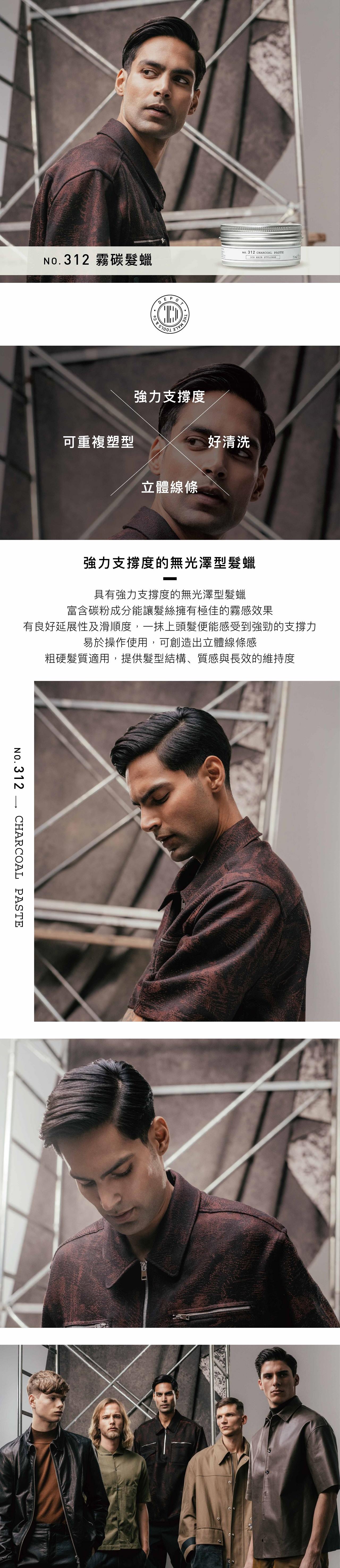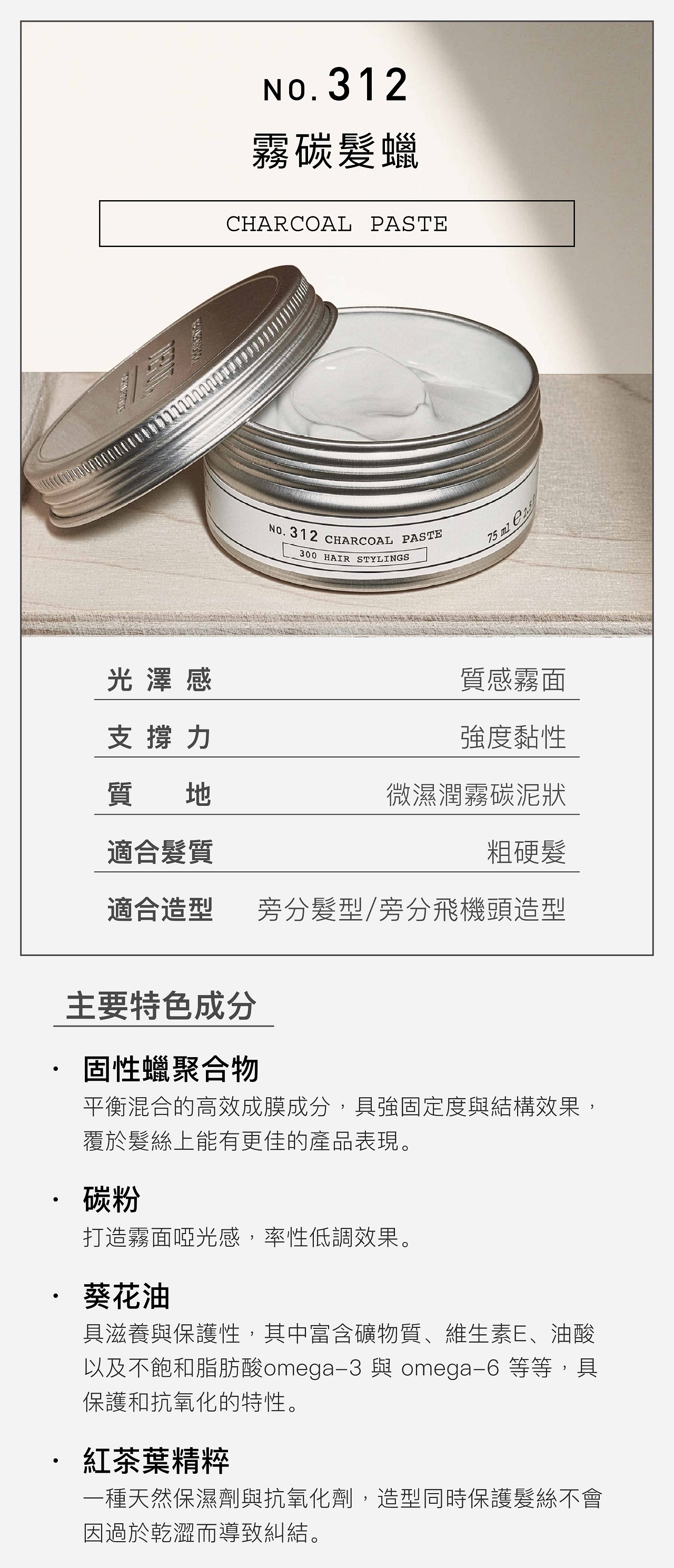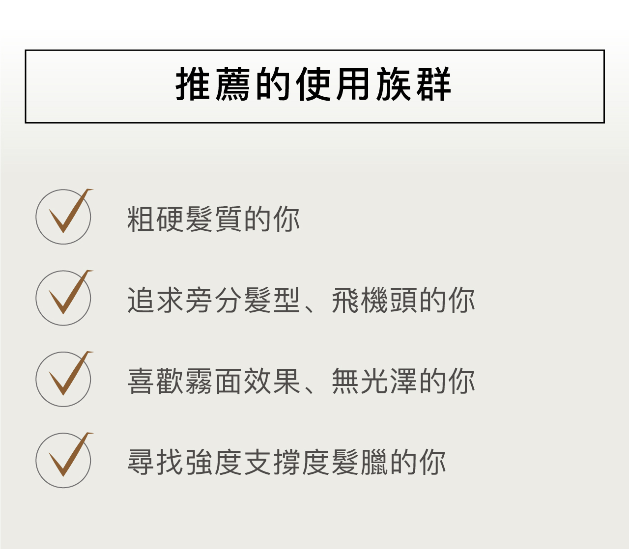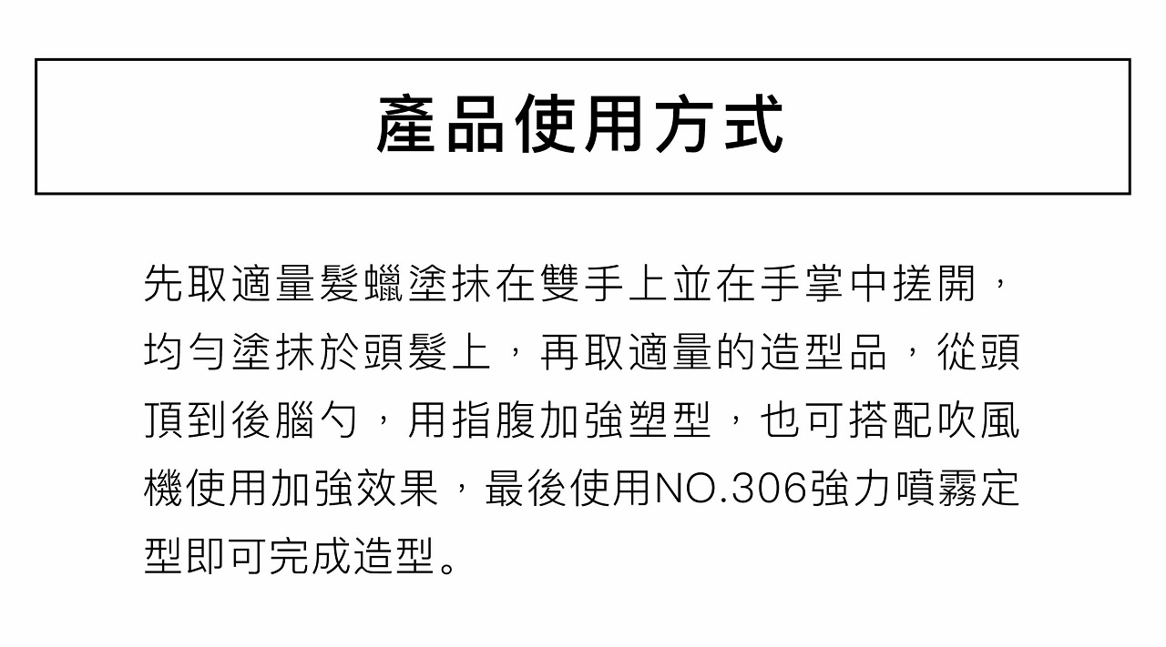 先取適量髮漿塗抹在雙手上並在手掌中搓開,均勻塗抹於頭髮上,再取適量的造型品,從頭頂到後腦勺, 用指腹加強塑型,也可搭配吹風機,最後使用NO.306強力噴霧定型即可完成造型