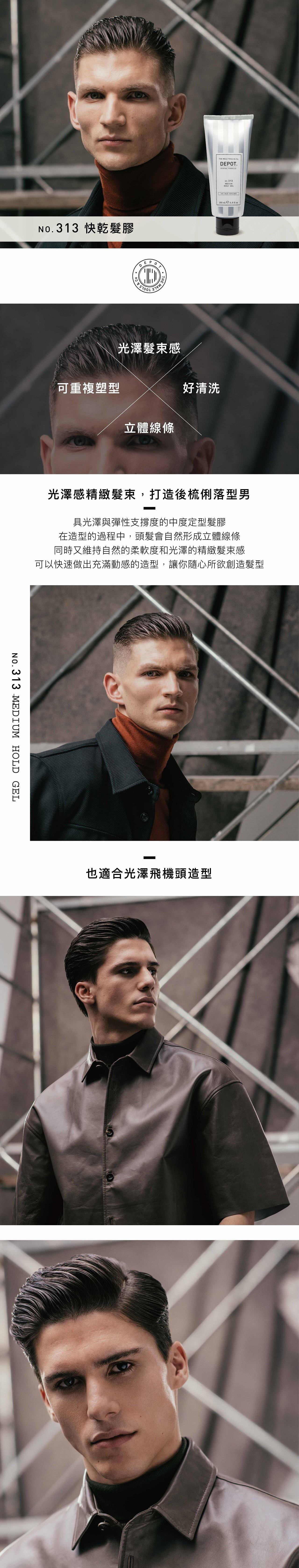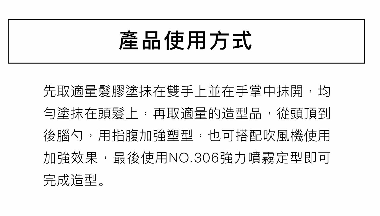 先先取適量髮膠塗抹在雙手上並在手掌中抹開,均勻塗抹在頭髮上,再取適量的造型品,從頭頂到後腦勺, 用指腹加強塑型,也可搭配吹風機使用做出造型,最後使用NO.306強力噴霧定型即可完成造型
