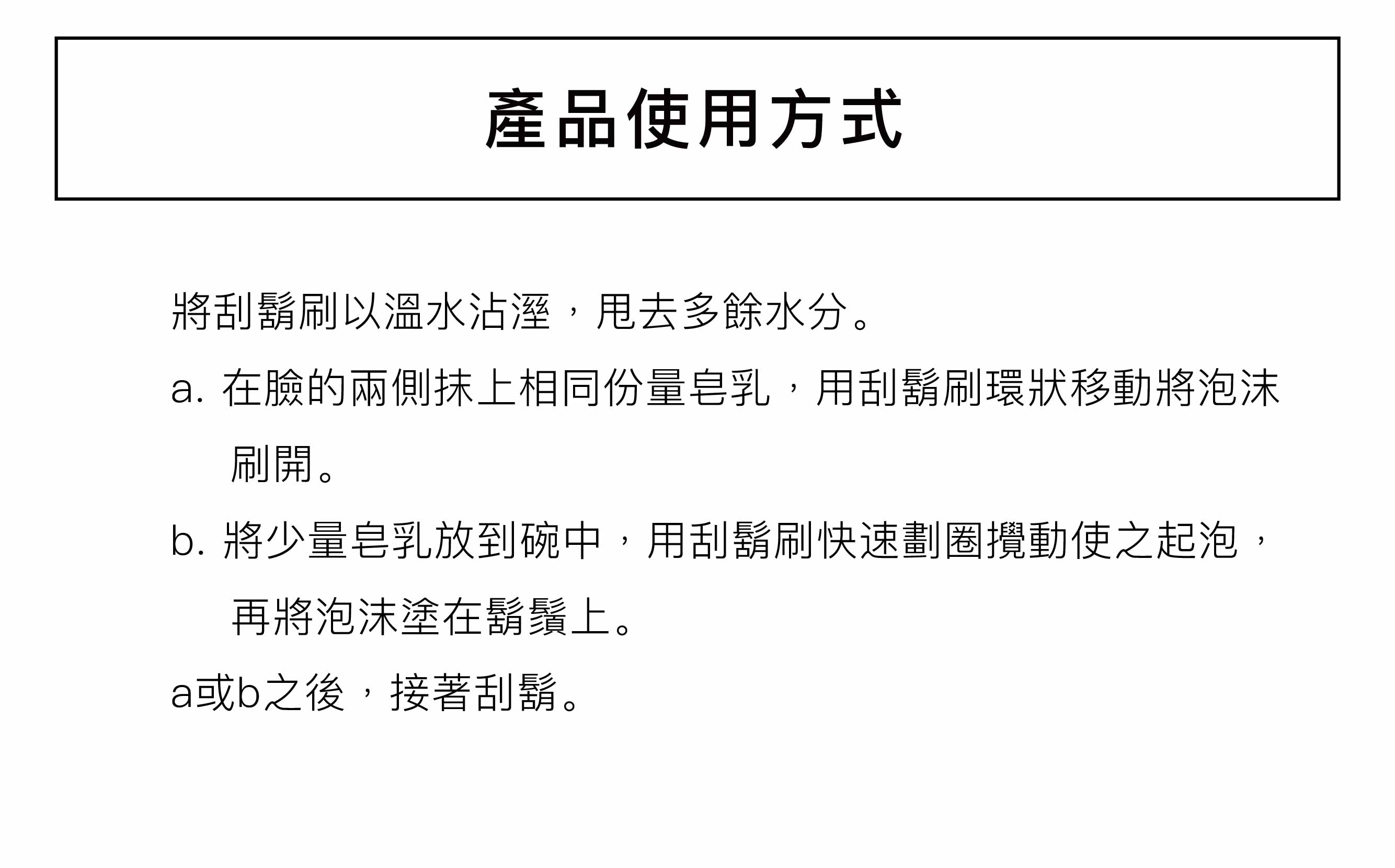 a.在臉的兩側抹上相同份量皂乳,用刮鬍刷環狀移動將泡沫刷開。