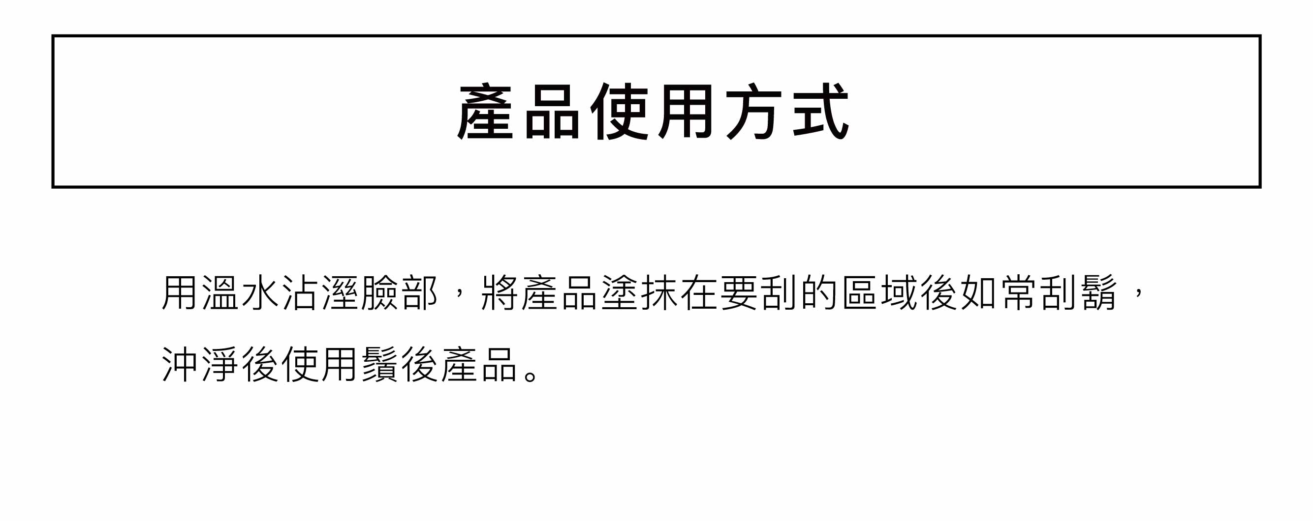 用溫水沾溼臉部,將產品塗抹在要刮的區域後如常刮鬍,沖淨後使用鬚後產品。