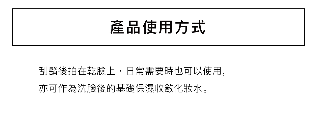 刮鬍後拍在乾臉上,日常需要時也可以使用,亦可作為洗臉後的基礎保濕收斂化妝水