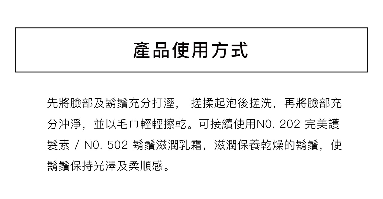 先將臉部及鬍鬚充分打溼,搓揉起泡後搓洗,再將臉部充分沖淨,並以毛巾輕輕擦乾。可接續使用NO.202完美護髮素,滋潤保養乾燥的鬍鬚,使鬍鬚保持光澤及柔順感