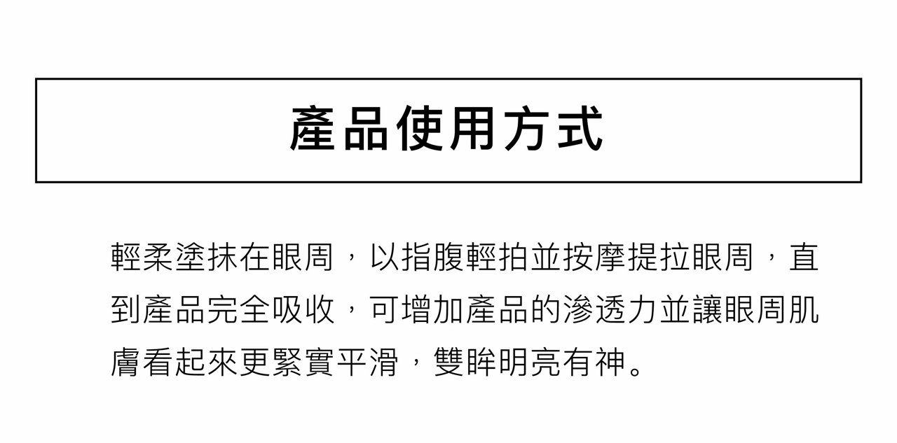 早晚輕柔塗抹在眼周,以指腹輕拍並按摩提拉眼周,直到產品完全吸收,可增加產品的滲透力並讓眼周肌膚看起來更緊實平滑,雙眸明亮有神