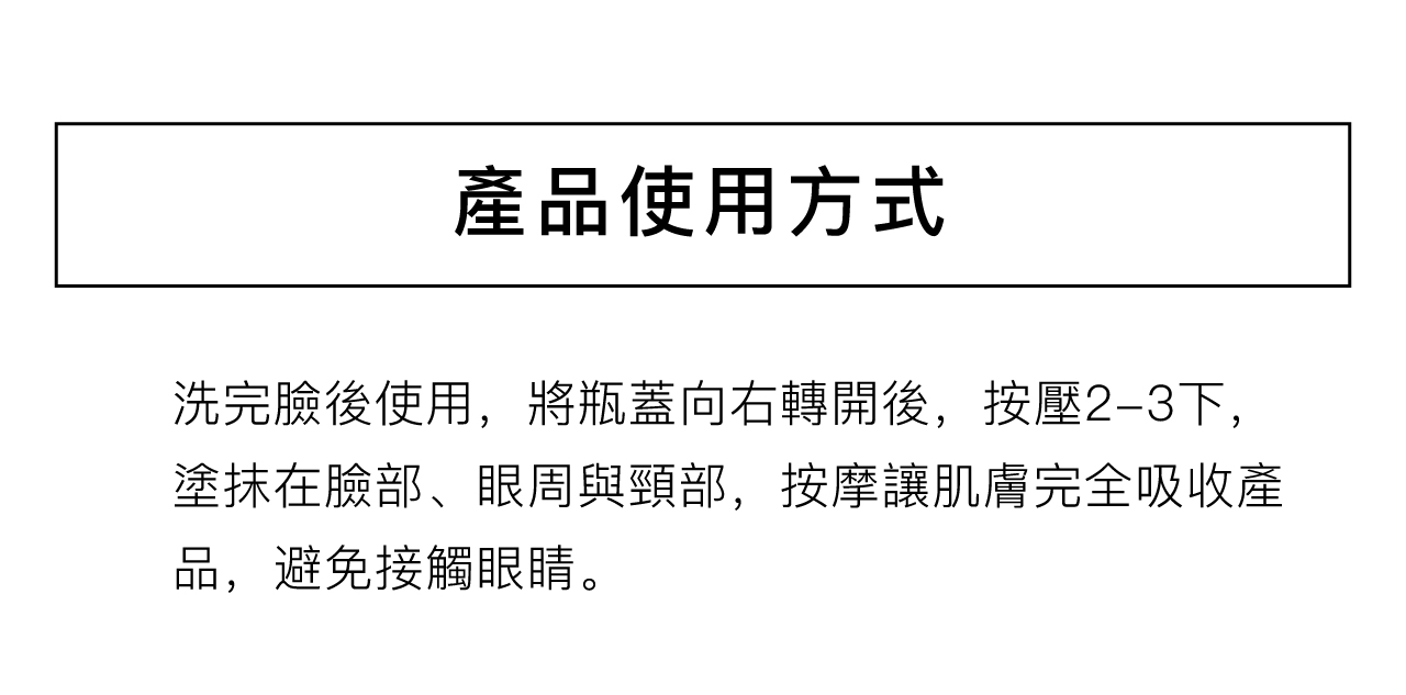 早晚輕柔塗抹在眼周,以指腹輕拍並按摩提拉眼周,直到產品完全吸收,可增加產品的滲透力並讓眼周肌膚看起來更緊實平滑,雙眸明亮有神