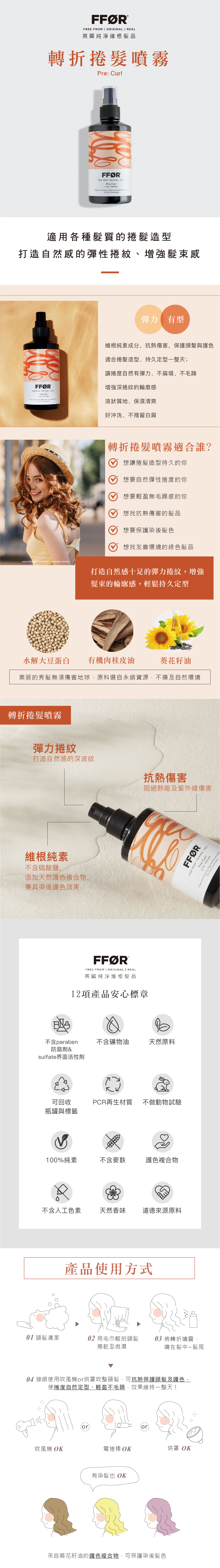 將轉折噴霧均勻噴灑於乾淨微濕髮上,讓髮幹與髮尾吸收以增強效果,將秀髮吹乾後可接續造型。