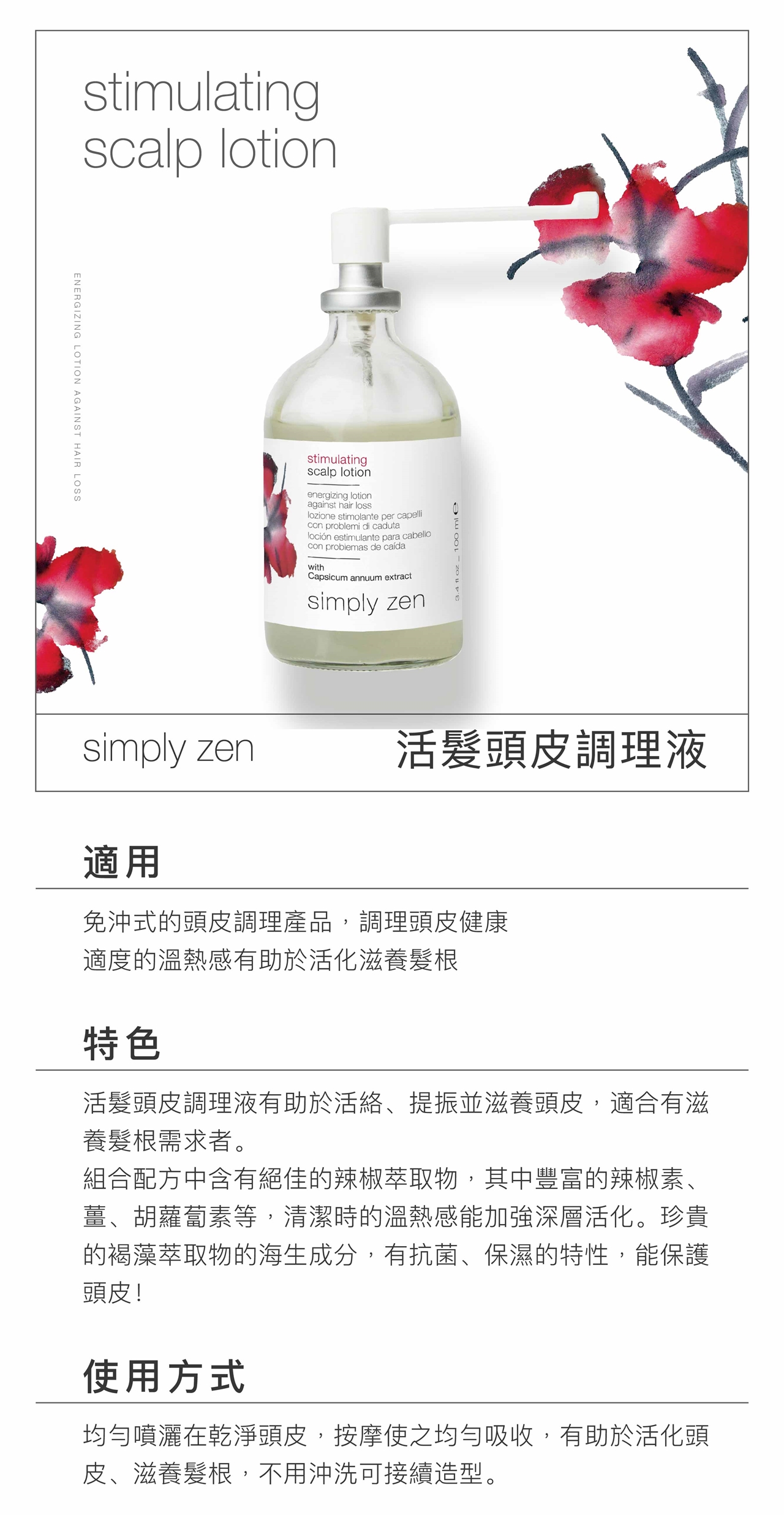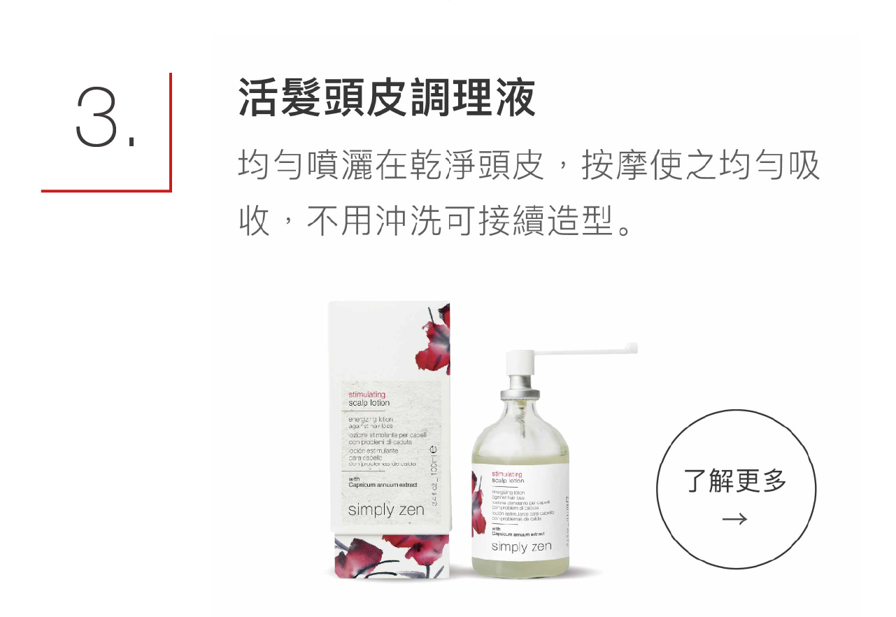 均勻噴灑在乾淨頭皮,按摩使之均勻吸收,有助於活化頭皮、滋養髮根,不用沖洗可接續造型。