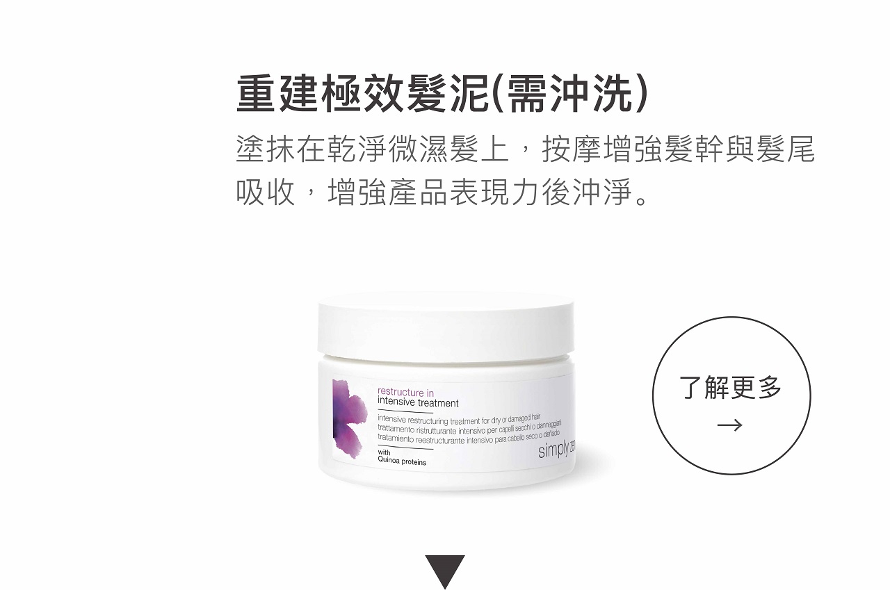 依髮量擠壓數次,噴在乾淨微濕髮上,仔細按摩讓頭髮吸收,接著使用重建極效髮泥後沖淨,能更加強滑順功效