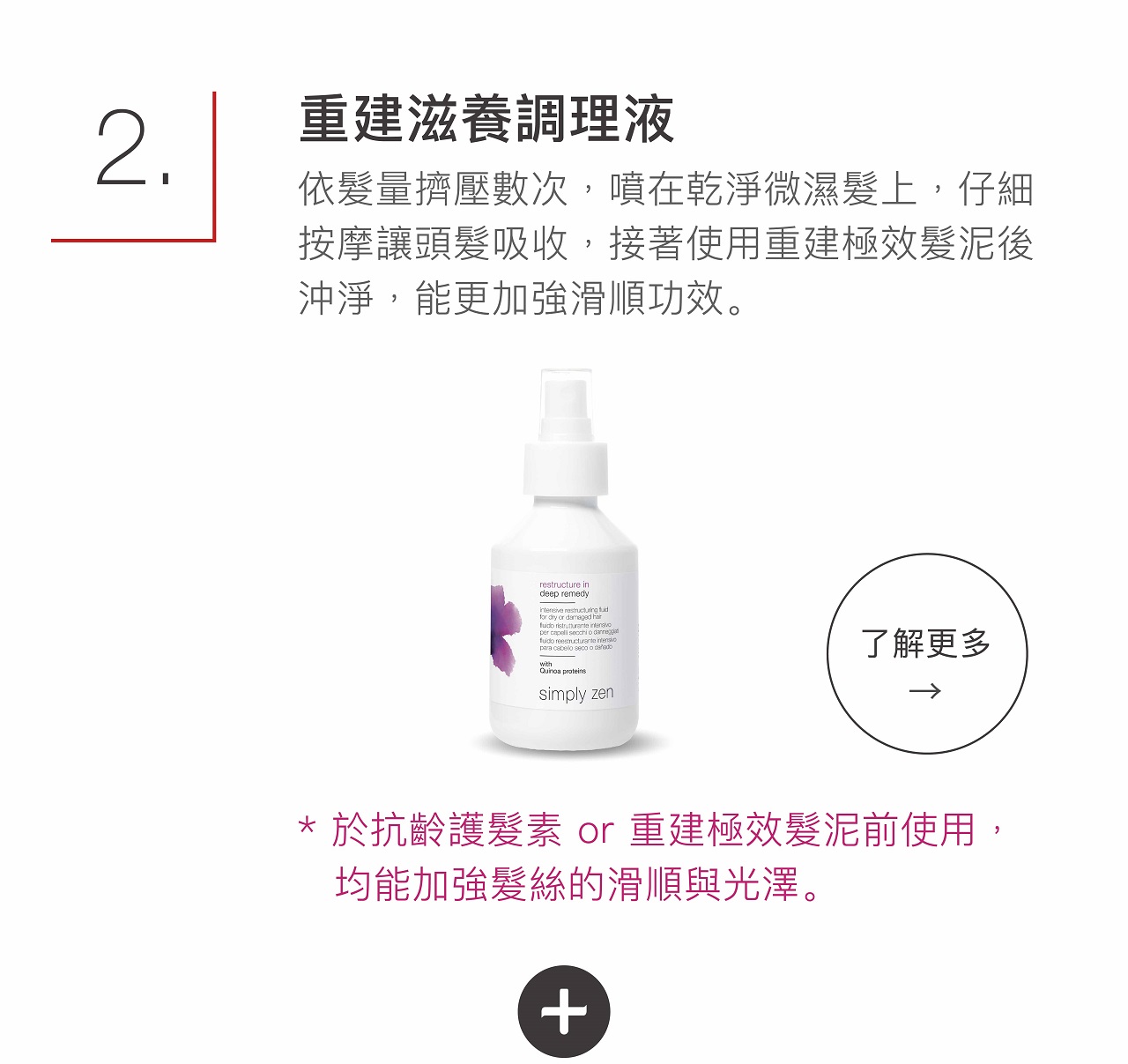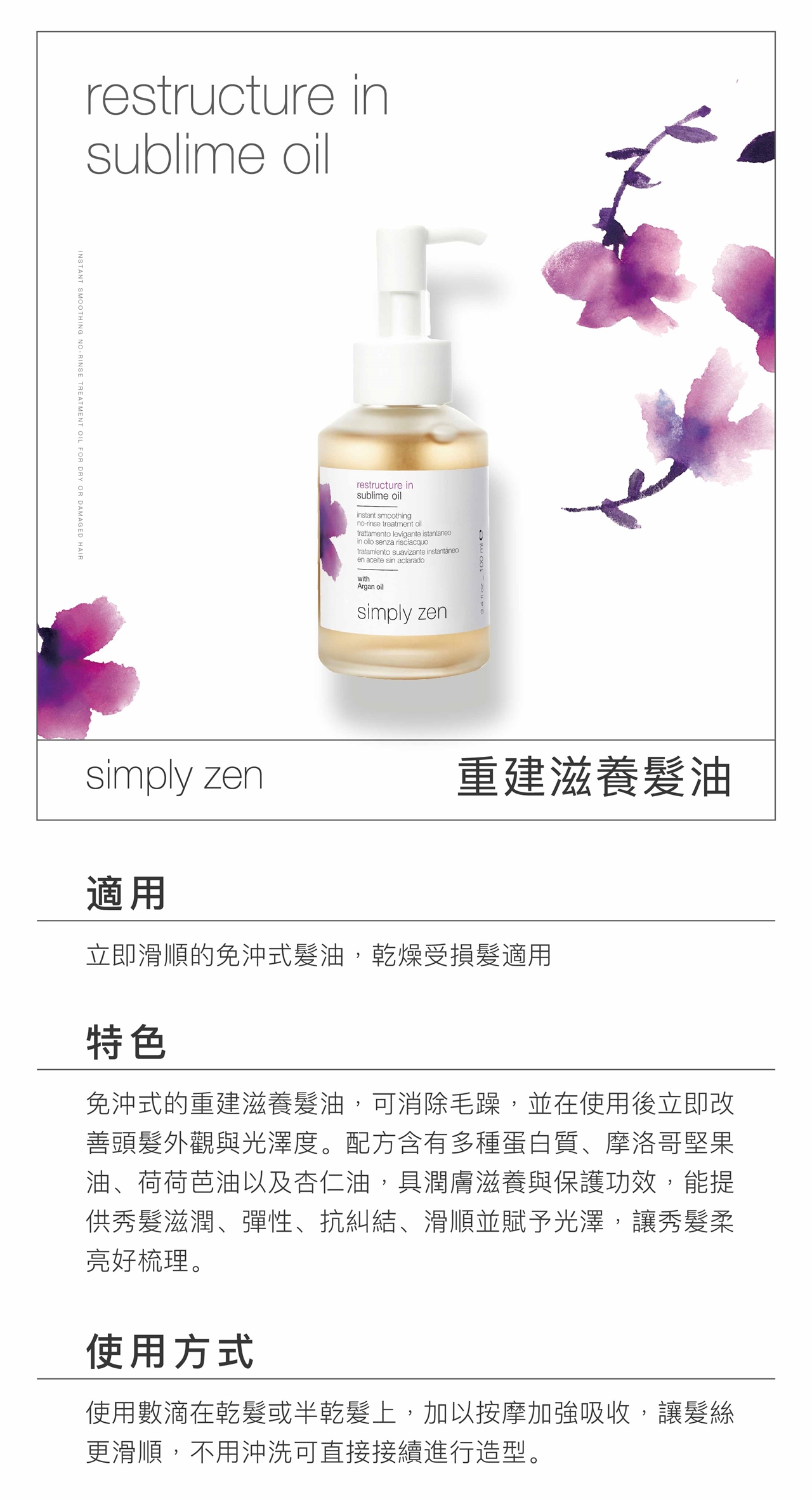 使用數滴在乾髮或半乾髮上,加以按摩加強吸收,讓髮絲更滑順,不用沖洗可直接接續進行造型